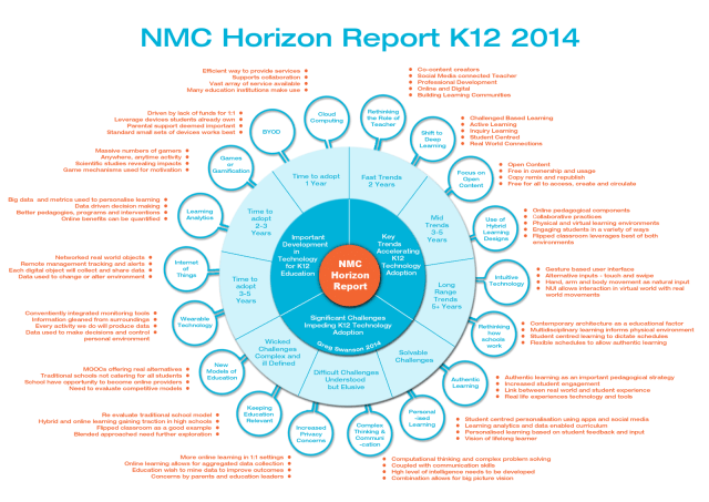 I was re-reading the Horizon Report the other day when it occurred to me that it could be easily summarised. This has helped me consolidate the main elements of the article in my own mind. It is always interesting to reflect on where your school or region is at in this whole process. I hope this is helpful for you too. Please feel free to use and share.