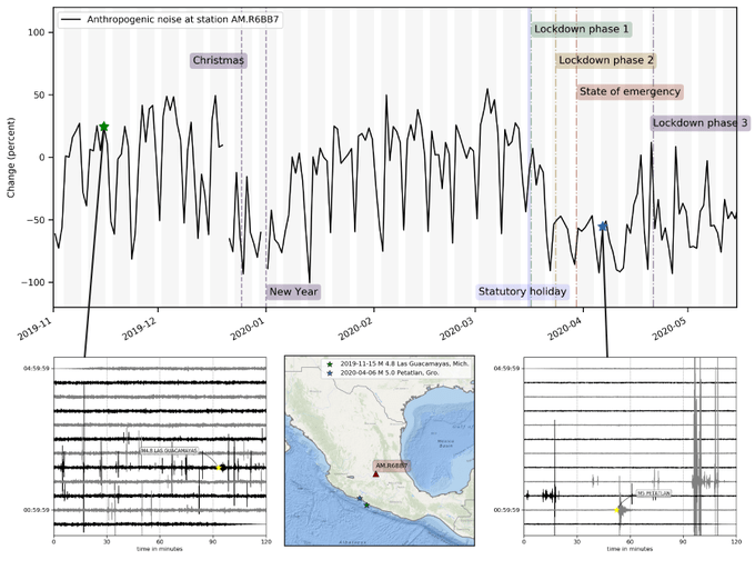 Measured using seismometers, seismic waves are the vibrations traveling within the Earth that could be set off by earthquakes or volcanoes. The waves could be subject to the disturbance caused due to human activities or naturally. In the study, it is found that the reduced human activity led to an average drop of around 50% human-caused seismic noise, which was recorded between March 2020 to May 2020. The drops in the seismic noise, especially in the urban areas, are unprecedented and are observed to be more than what is considered usual quiet periods like weekends, holidays, or during the night.