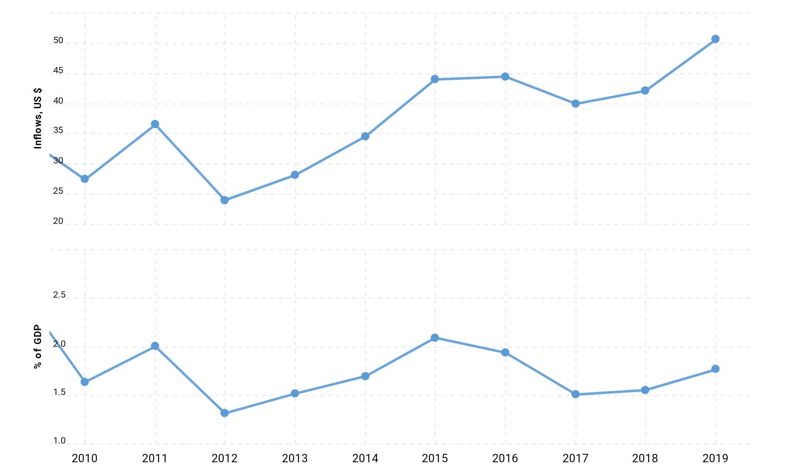 From the graph it is visible that the FDI inflows from 2010-2019 kept varying year after year.