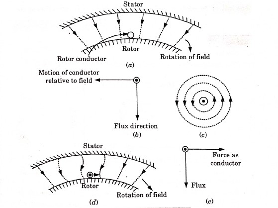 Let, us consider a rotor is stationary and the rotor conductors are present on it and the direction of magnetic field be clockwise. A magnetic field moving clockwise is equivalent to a conductor moving in anti clockwise direction in a stationary field. Now, according to Faraday’s Law of Electromagnetic Induction, a voltage will be induced in the conductor and a current will start to flow in the rotor conductors.
