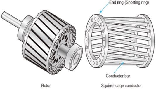 - Squirrel Cage type rotor: This is simples and most rugged construction. The rotor consist of a cylindrical laminated core with skewed rotor slots. The rotor conductors which are thick copper rods are placed in these slots and welded to end rings. The rotor conductors are permanently short circuited and hence an external resistance can’t be added in between. The rotor body is made up of silicon steel stampings. The Construction of this rotor looks like cage of squirrel.