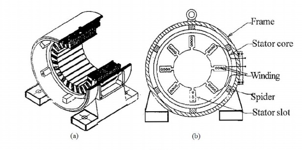 - Stator- It is stationary part of the motor and is made up of silicon steel stampings i.e. thin sheets and these stampings are slotted. These slots are formed on inner side of stator. In, these slots a three phase winding is accommodated, the winding may be connected in star or delta. The three ends of this winding are brought out from terminal box, where three phase AC supply is connected.