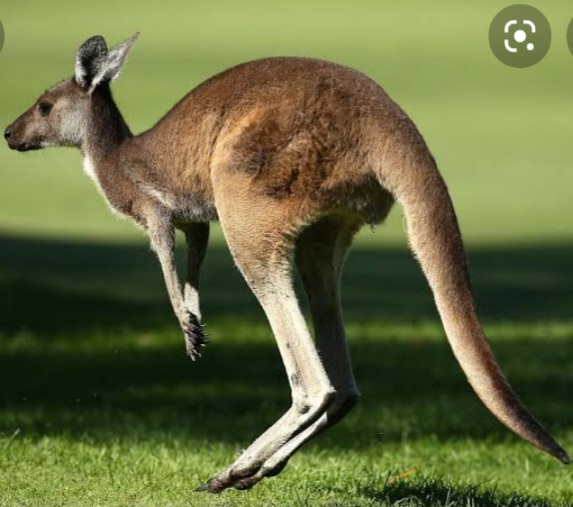 Kangaroos are the only large animals that hop as a primary means of locomotion. Their springy hind legs and feet are much stronger and larger than their arms (or “forelimbs”). According to the San Diego Zoo, kangaroos can cover 15 feet (7 m) in a single hop and can hop as fast as 30 mph (48 kph). Usually, 20 mph (32 kph) is considered their cruising speed. When feeding, kangaroos use a slower, walking movement, and for that they use their muscular tail as a kind of fifth leg, pushing off the ground as they move along.