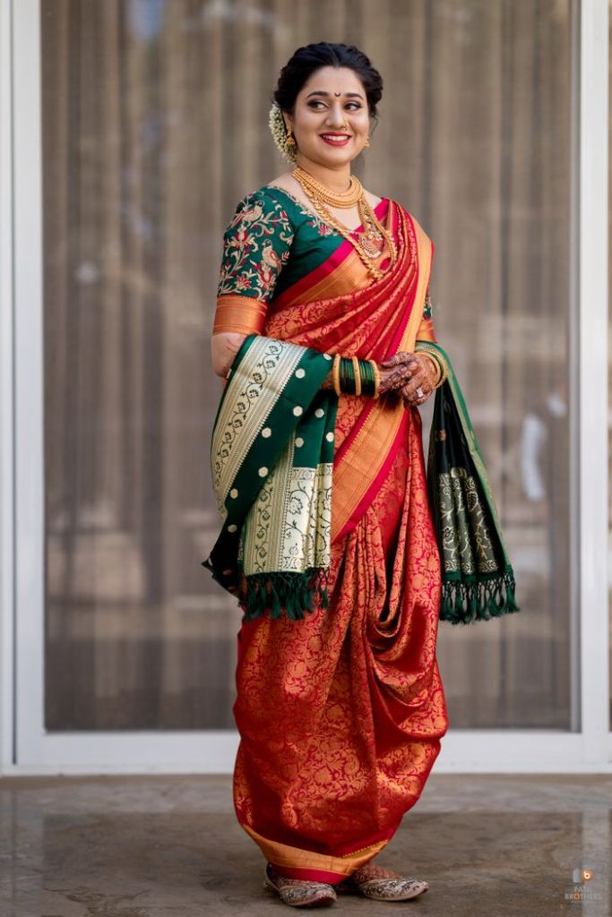 It’s a 9-yard saree drape and is one of the most popular drapes in the region. It helps you to walk quickly and lets you sit comfortably on the floor or handle any amount of work with ease.