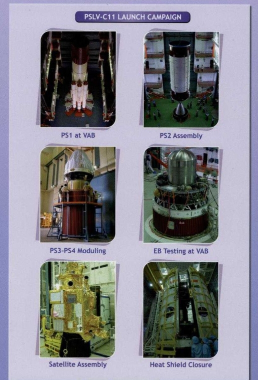Vikram Sarabhai Space Centre (VSSC), Thiruvananthapuram, designed and developed PSLV-C11. ISRO Inertial Systems Unit (IISU) at Thiruvananthapuram developed the inertial systems for the vehicle. Liquid Propulsion Systems Centre (LPSC), also at Thiruvananthapuram, developed the liquid propulsion stages for the second and fourth stages of PSLV-C11 as well as reaction control systems. SDSC SHAR processed the solid motors and carries out launch operations. ISRO Telemetry, Tracking and Command Network (ISTRAC) provide telemetry, tracking and command support during PSLV-C11’s flight