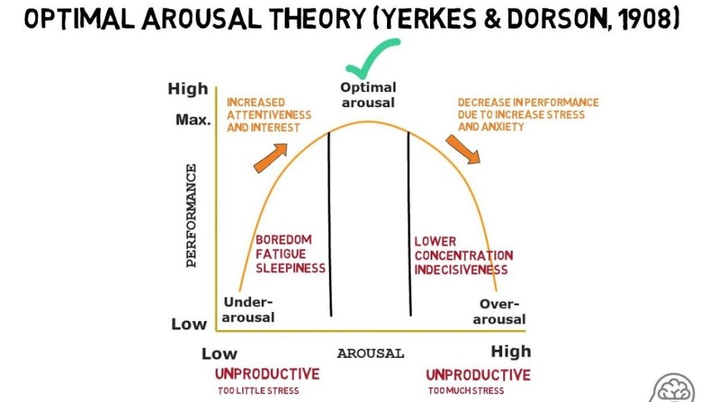 Arousal Theory suggests that people are motivated to maintain an optimal level of internal arousal—neither too low nor too high. Too little arousal leads to boredom and disengagement; too much arousal creates stress and anxiety. Motivation arises from the desire to return to the ideal zone where performance and focus peak. This explains why some individuals seek thrill, challenge, or novelty (high-arousal seekers), while others prefer calm, stable environments (low-arousal seekers). The theory also aligns with the Yerkes–Dodson Law, which states that moderate arousal produces the best performance. In workplaces and classrooms, designing tasks that are stimulating but not overwhelming helps individuals stay engaged and motivated.