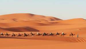 Until modern times, the camel was the backbone of the caravan trade, a central pillar of the economy in large parts of Asia and Africa. In settled regions, the caravansary, located on the outskirts of most urban centres, served as a hub for business and as a source of information about the outside world for the city’s residents. In the central Islamic lands, it likewise set the scene for many tales in the rich Arab-Persian oral tradition of storytelling, such as those found in The Thousand and One Nights. In Central Asia, vast and numerous camel caravans ensured the wealth and growth of the great trading cities of the Silk Road, upon which goods moved between Asia and Europe.