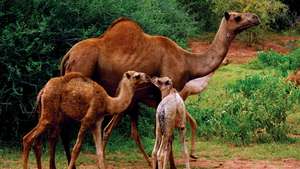 When not corralled, camels form stable groups of females accompanied by one mature male. Females breed by three to four years of age. Males begin to manufacture sperm at age three but do not compete for females until they are six to eight years old. Males compete for dominance by circling each other with the head held low and biting the feet or head of the opponent and attempting to topple it. After one camel withdraws from the bout, the winner may roll and rub secretions onto the ground from a gland on the back of its head. The dominant male breeds with all the females in each stable group. After a gestation of 13 or 14 months, one calf weighing up to 37 kg (81 pounds) is born, usually during the rainy season. Milk yields of 35 kg (about 77 pounds) per day are achieved in some breeds (e.g., the “milch dromedary” of Pakistan), though normal yield is about 4 kg (9 pounds) per day. Herders typically divert most milk to their own use during the calf’s first 9 to 11 months, then force weaning and take the rest. The calf is otherwise suckled 12 to 18 months. Females and males reproduce until about 20 years old. Longevity is 40 years.